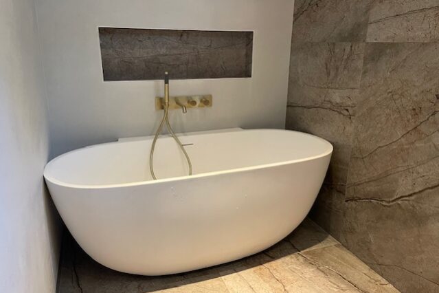 IVoor een klant in Hoensbroek een badkamer uitgevoerd met gouden wastafelkranen uit de muur, zoals ook de badkraan. tegels van 120 x 120