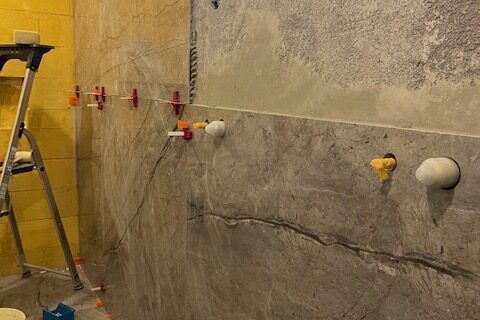 Voor onderstaande klant met een redelijke tot grote afmeting van de badkamer hebben wij ondanks tekeningen van badkamer specialist toch gekozen voor een andere indeling, Van een nis in de douche ruimte tot een muurtje bij het bad om diverse spullen op te zetten..